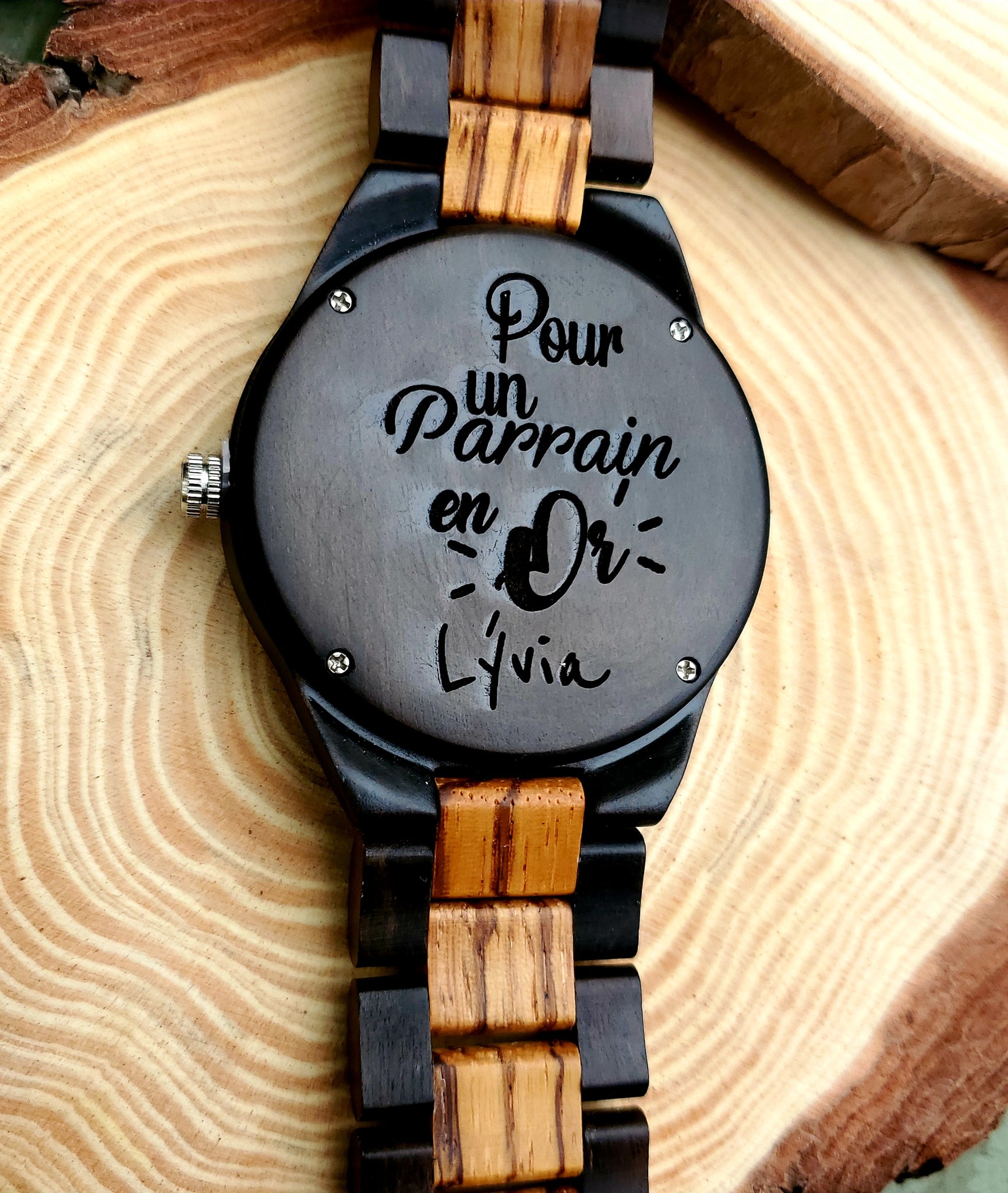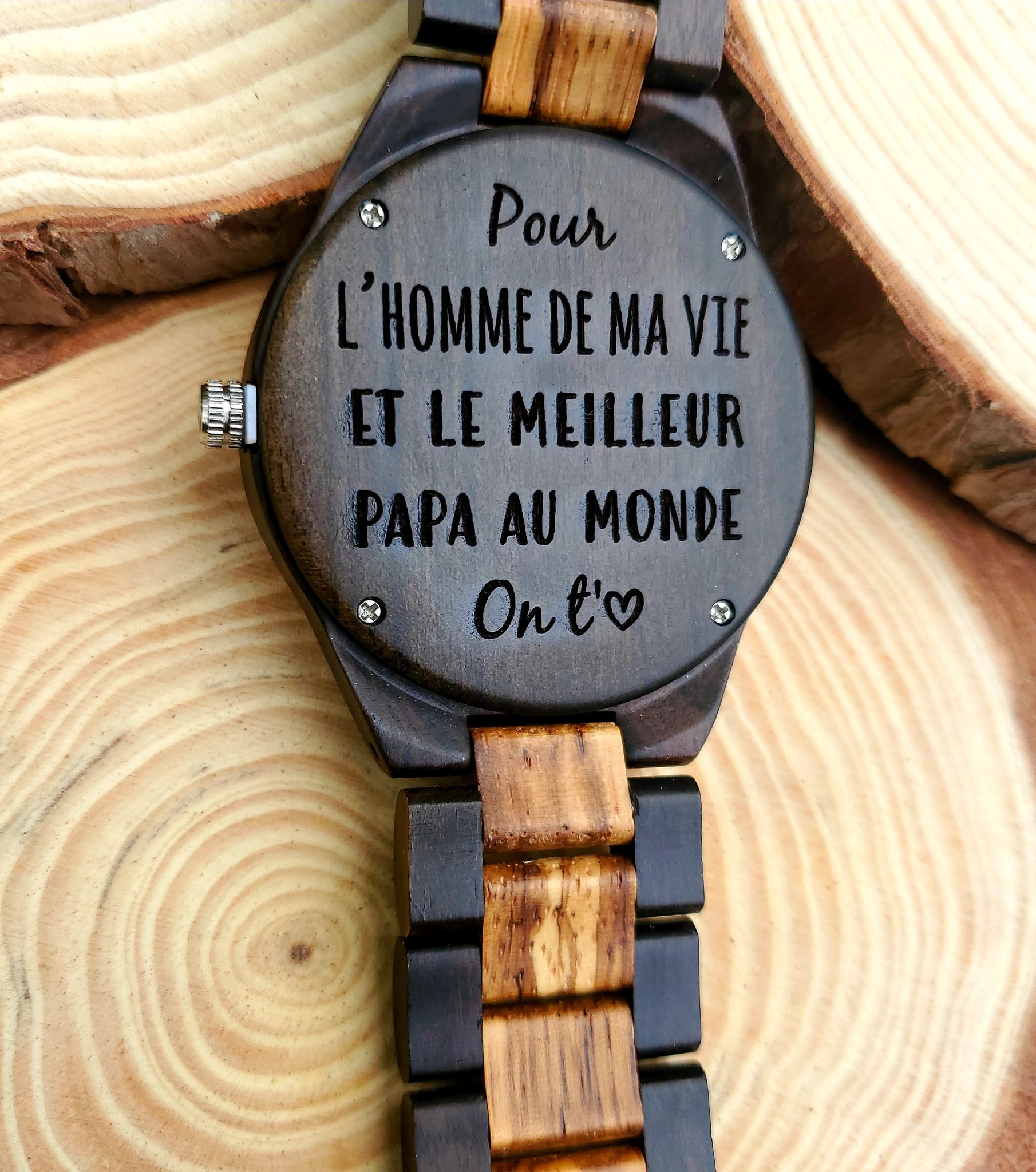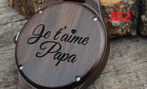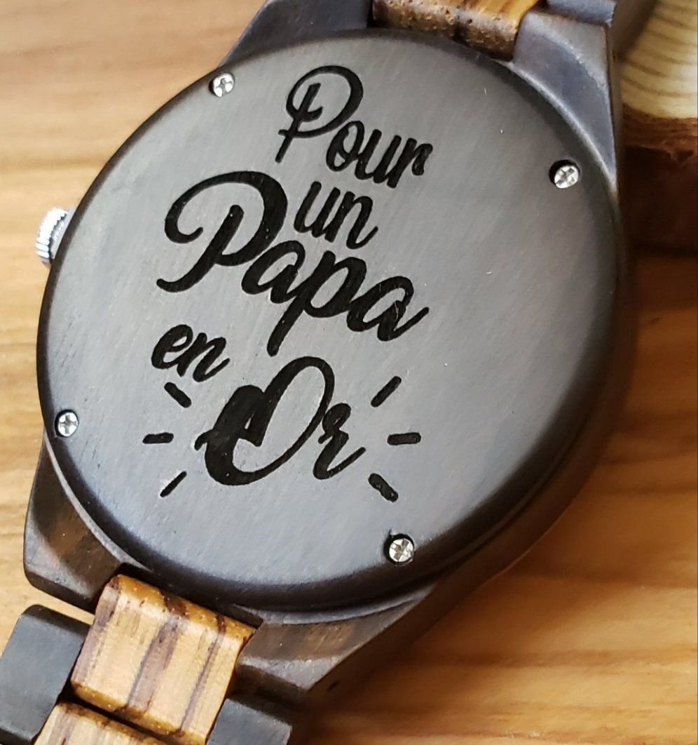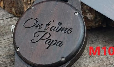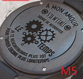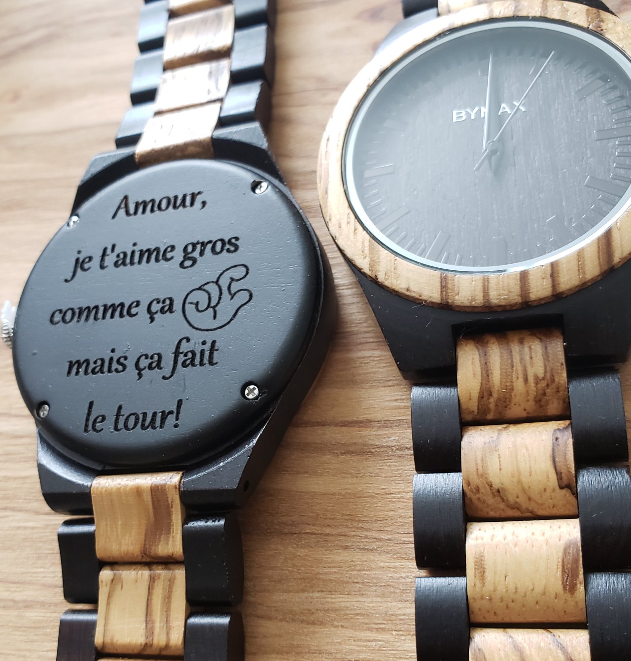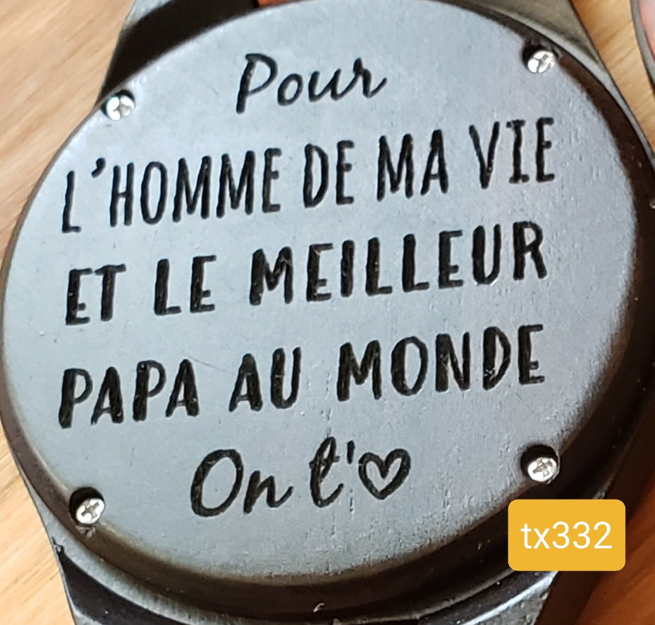 - Boite: carré en carton ,mais vous pouvez aussi vous procurer notre belle boite en bambou personnalisée avec votre message: voir dans la section:Montre