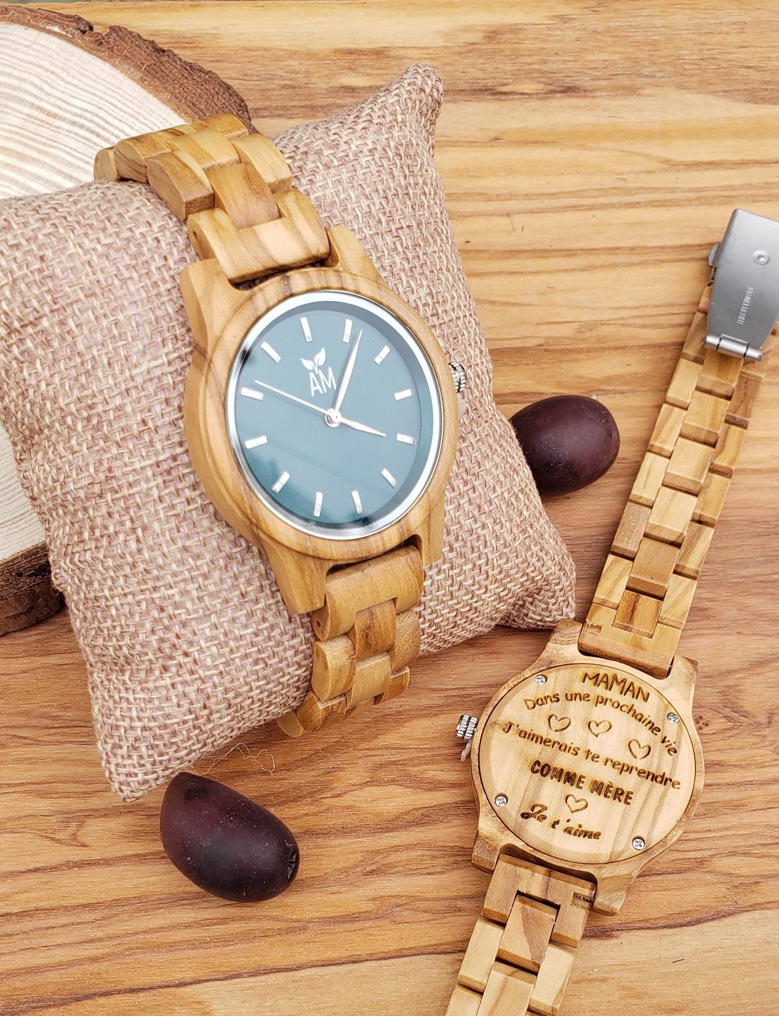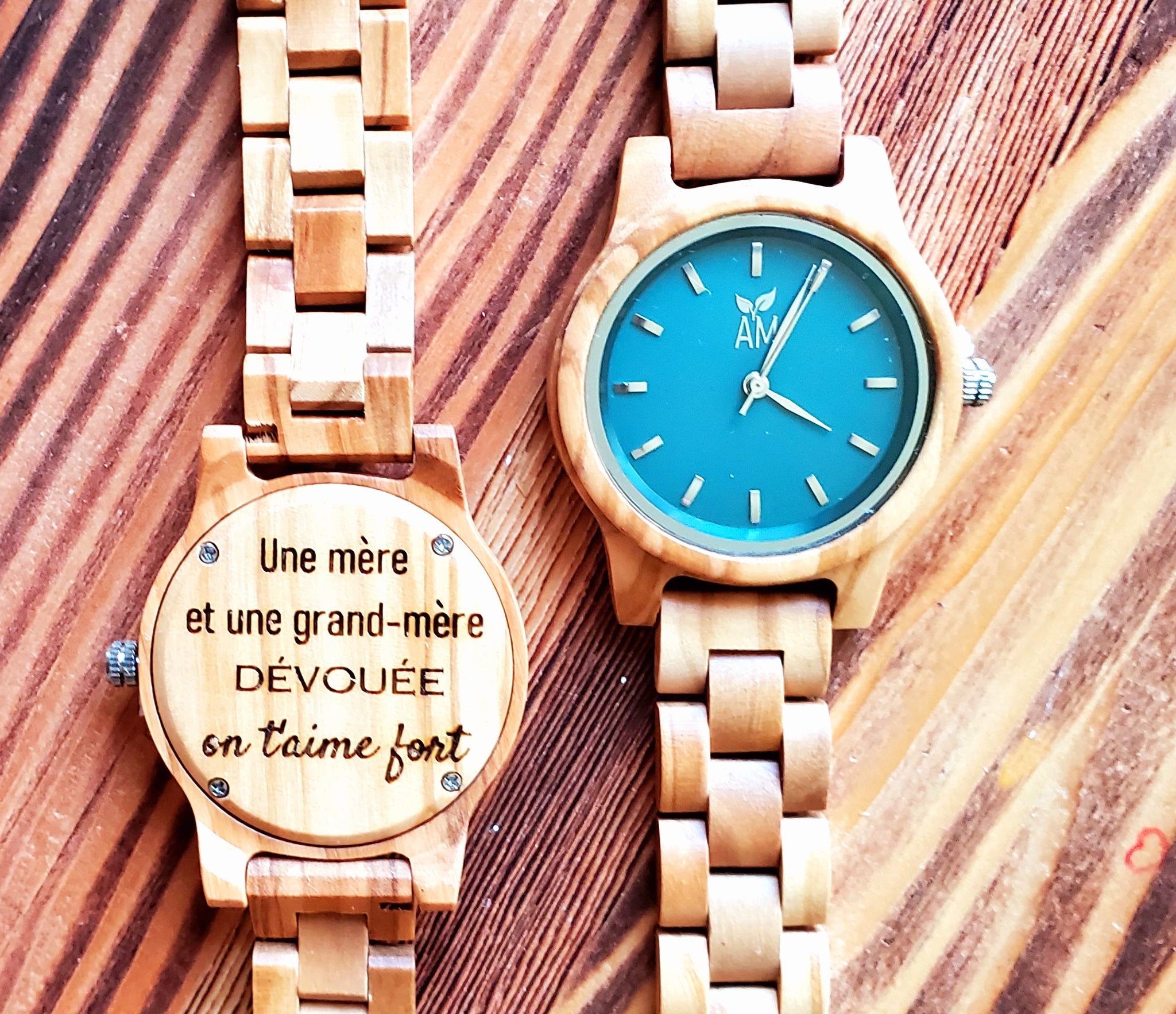 - Boite: carré en carton ,mais vous pouvez aussi vous procurer notre belle boite en bambou personnalisée avec votre message: voir dans la section:Montre