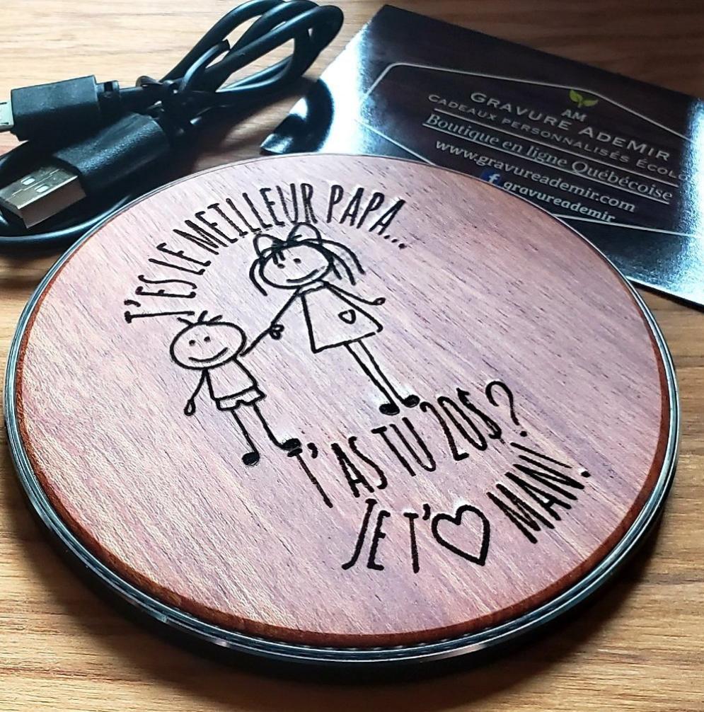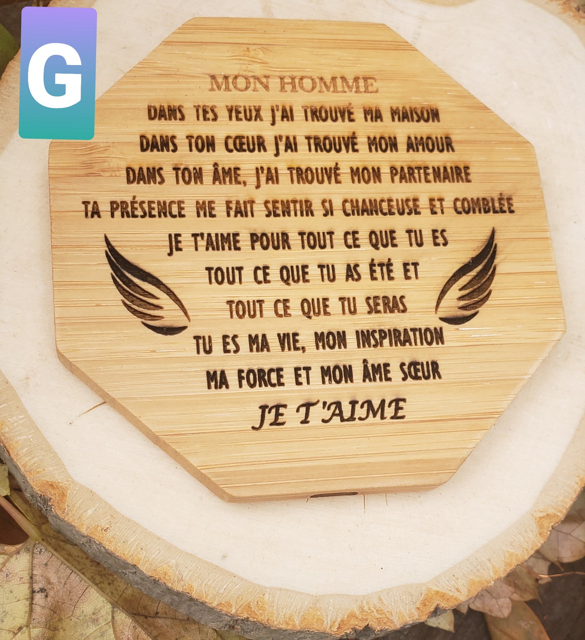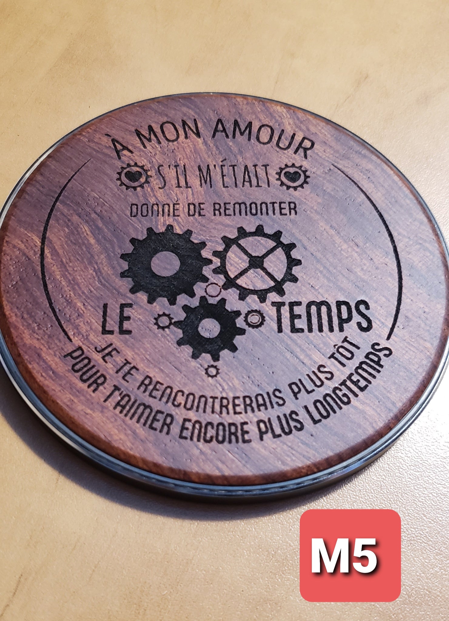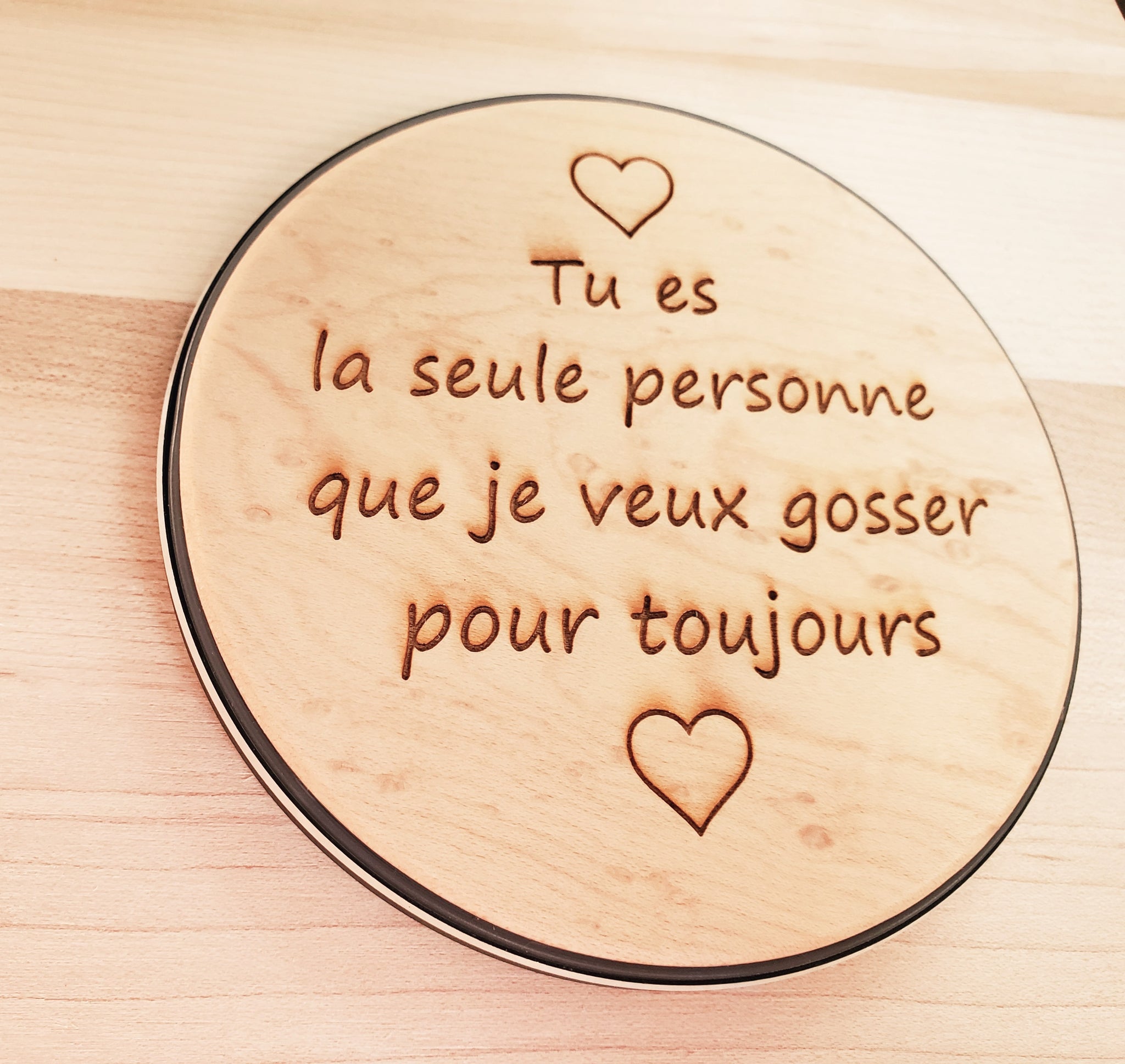 Gravée au laser avec un message et un motif de votre choix .Maximum 30 mots et un motif