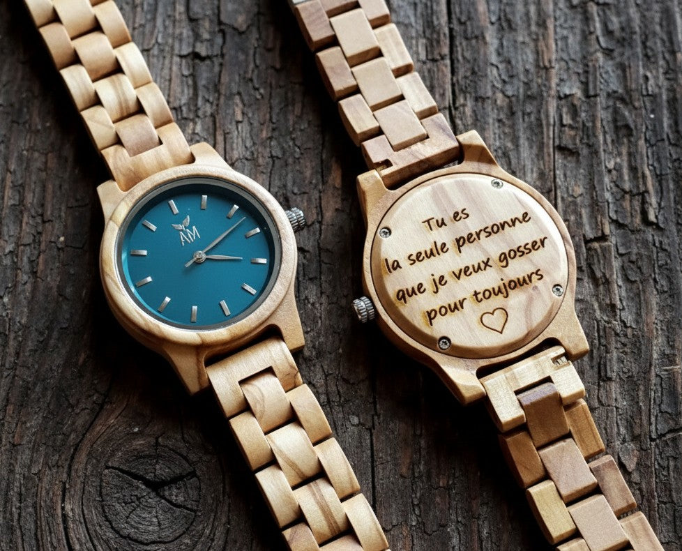 • Boite: carré en carton ,mais vous pouvez aussi vous procurer notre belle boite en bambou personnalisée avec votre message: voir dans la section:Montre