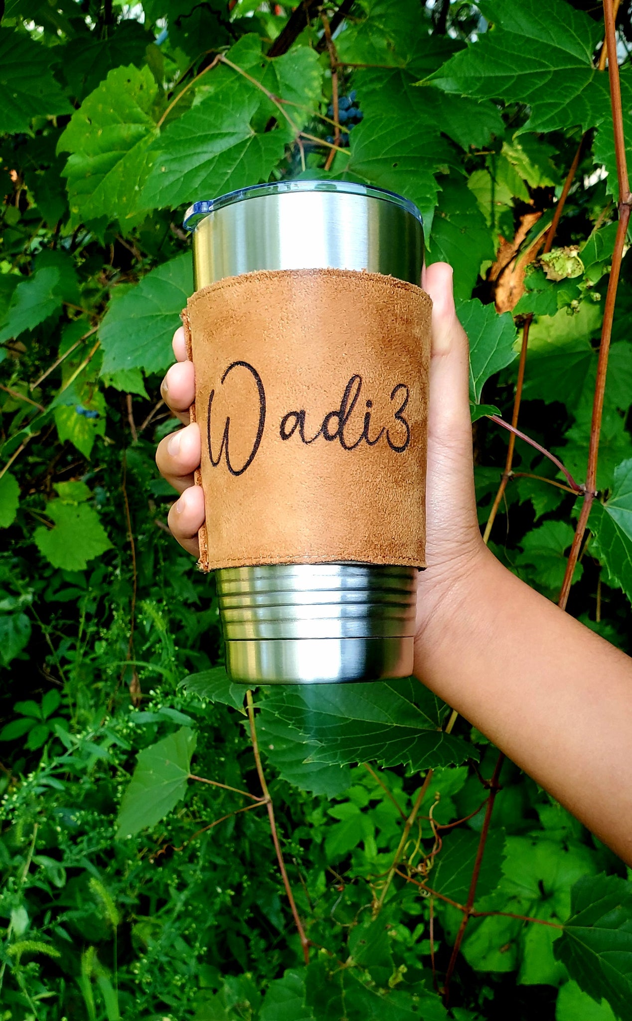 Avec bande en cuir qui peut etre personnalisée avec dessin et message de votre choix