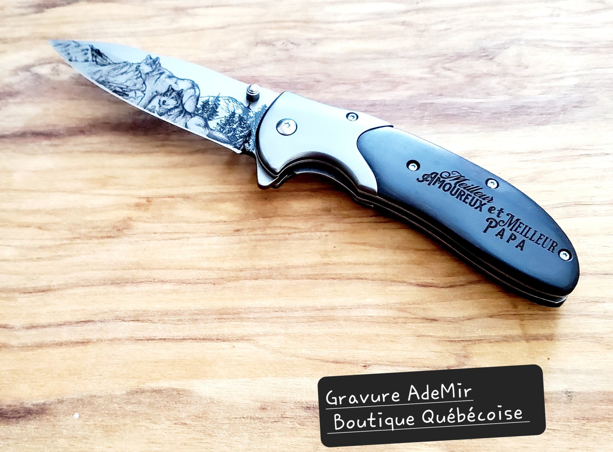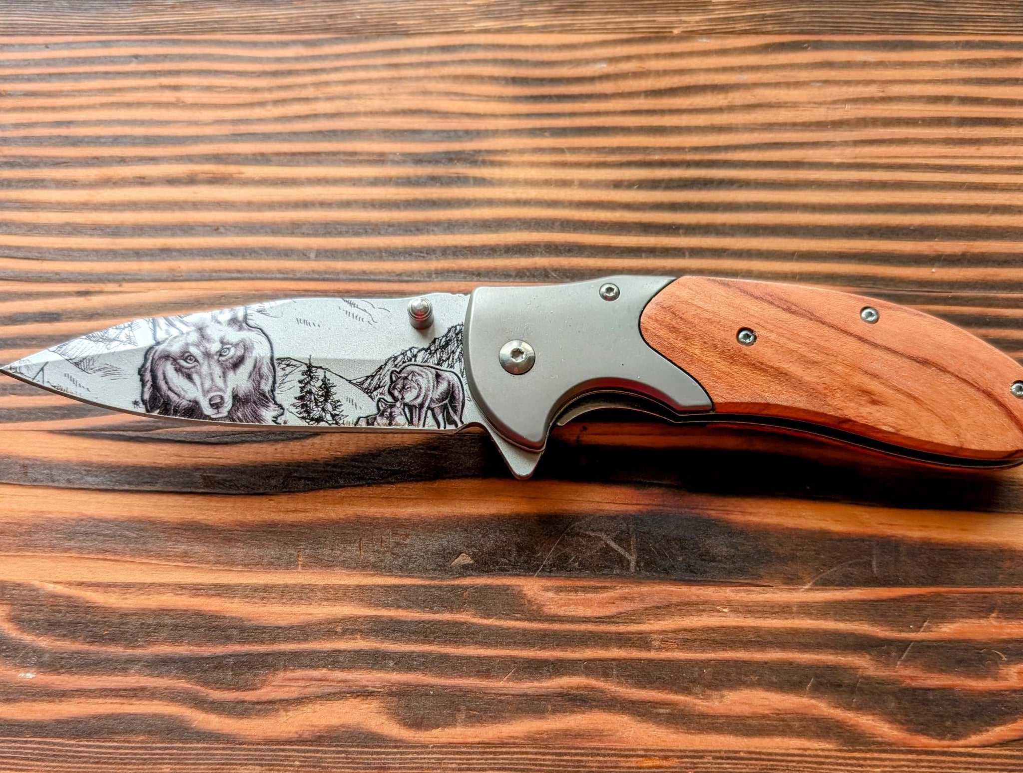Couteau de poche /manche en bois de rose et lame à motif Loup