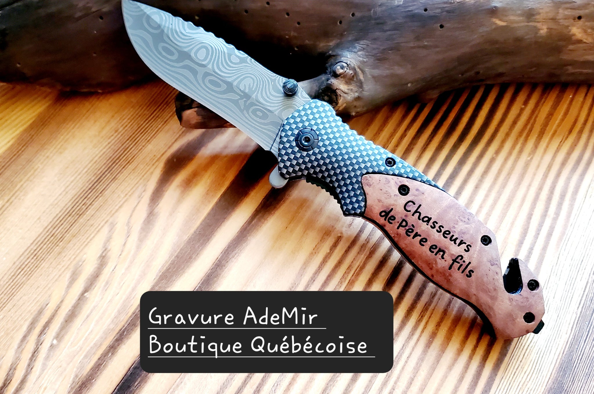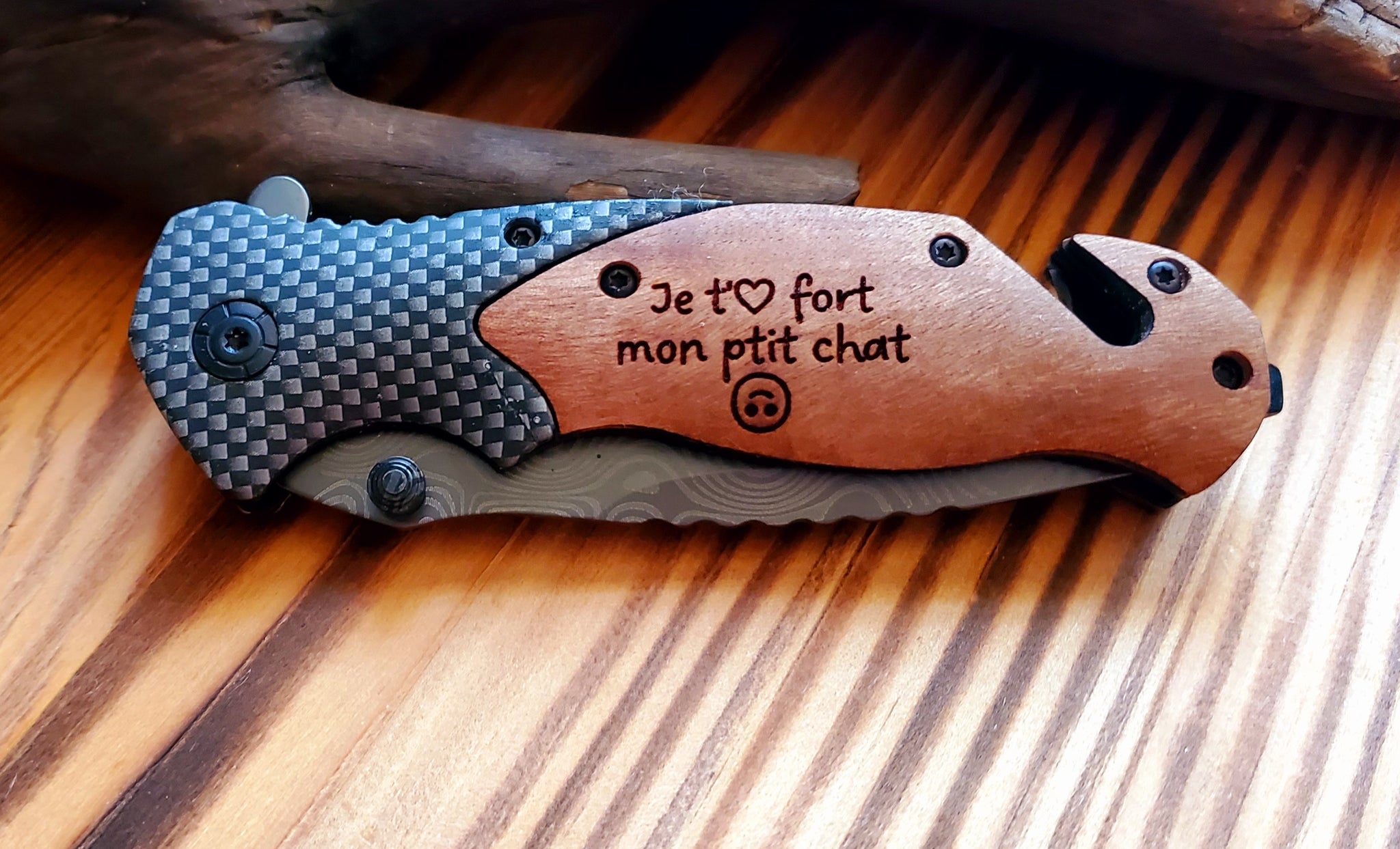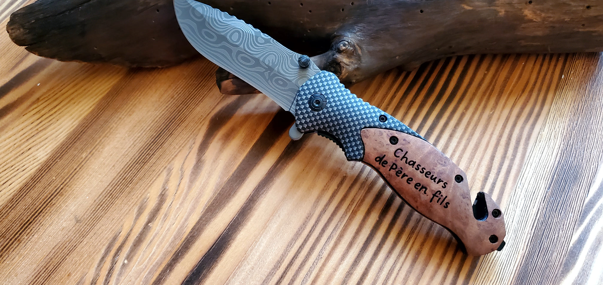 Couteau de poche /manche en bois d'olive et lame à motif damassé