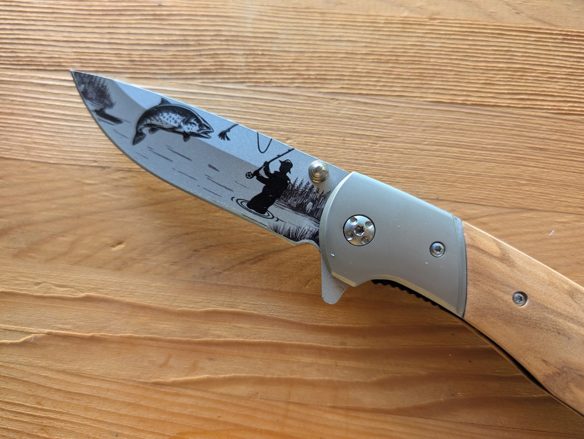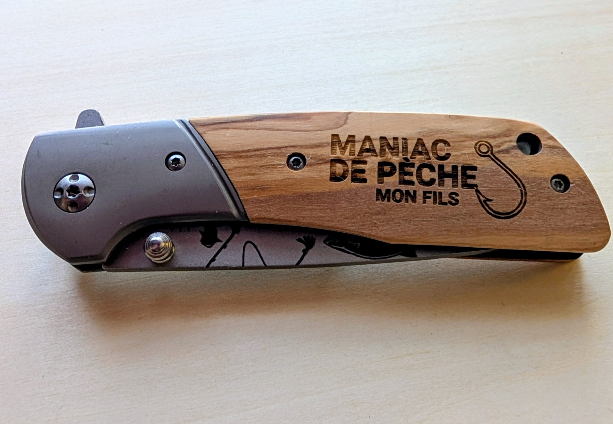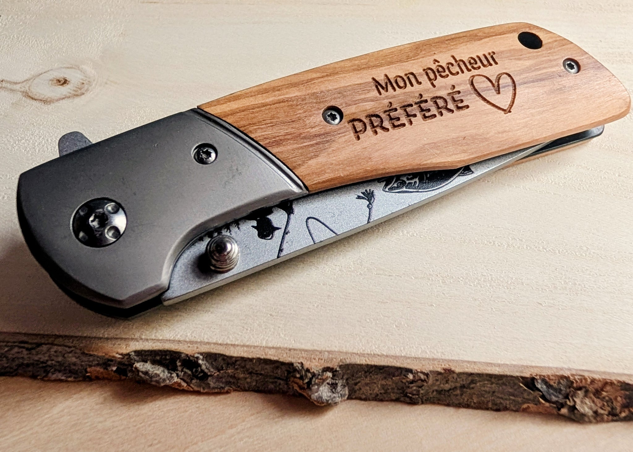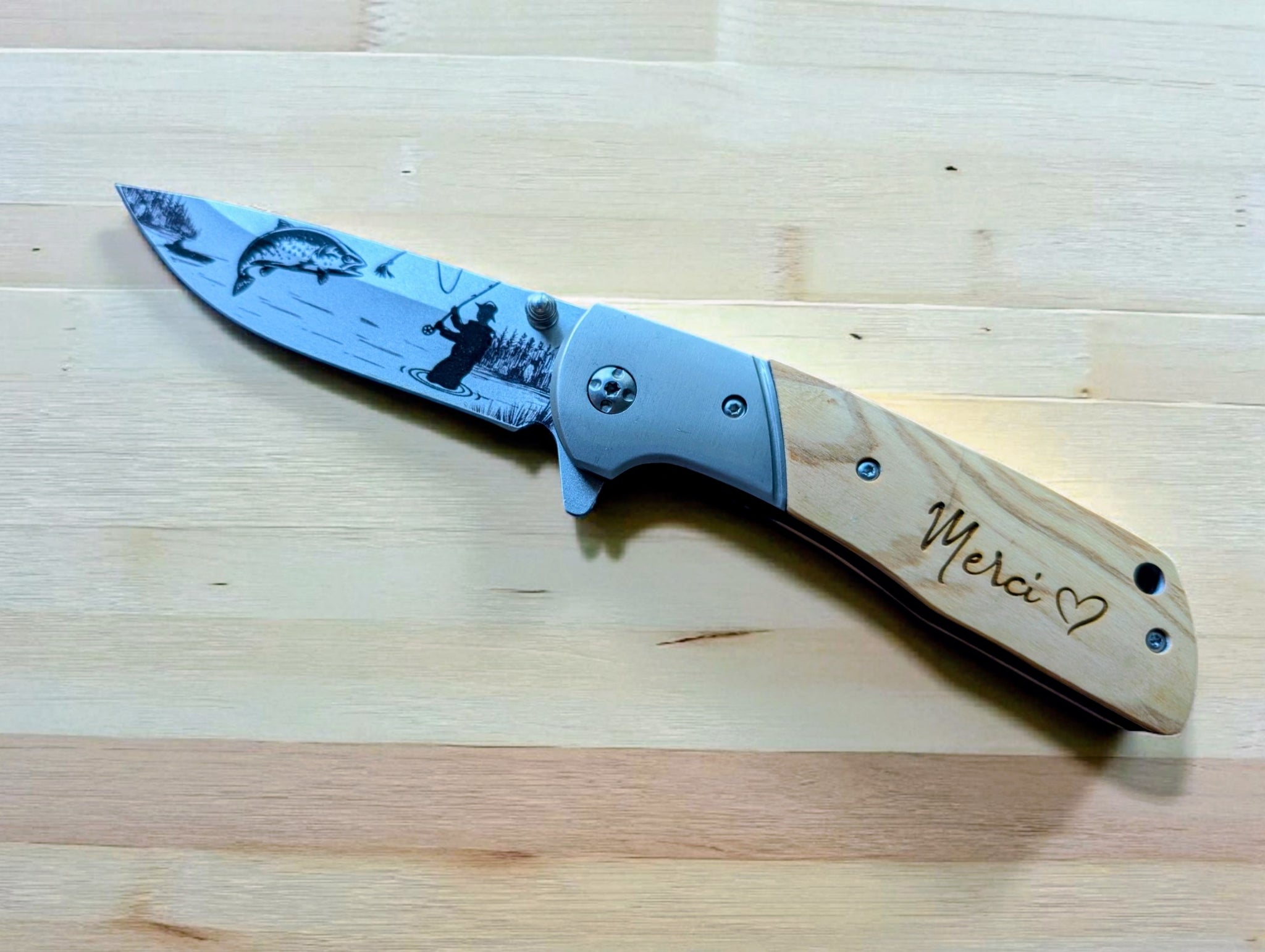Couteau de poche /manche en bois d'olive et lame à motif de peche