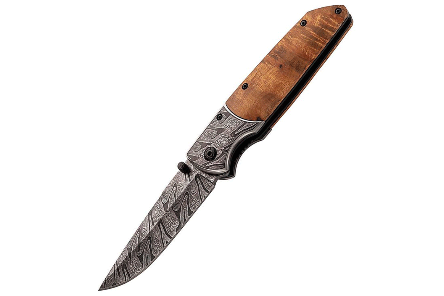 Couteau de poche /manche en bois d'olive orné de motif de feuilles au bout et lame à motif