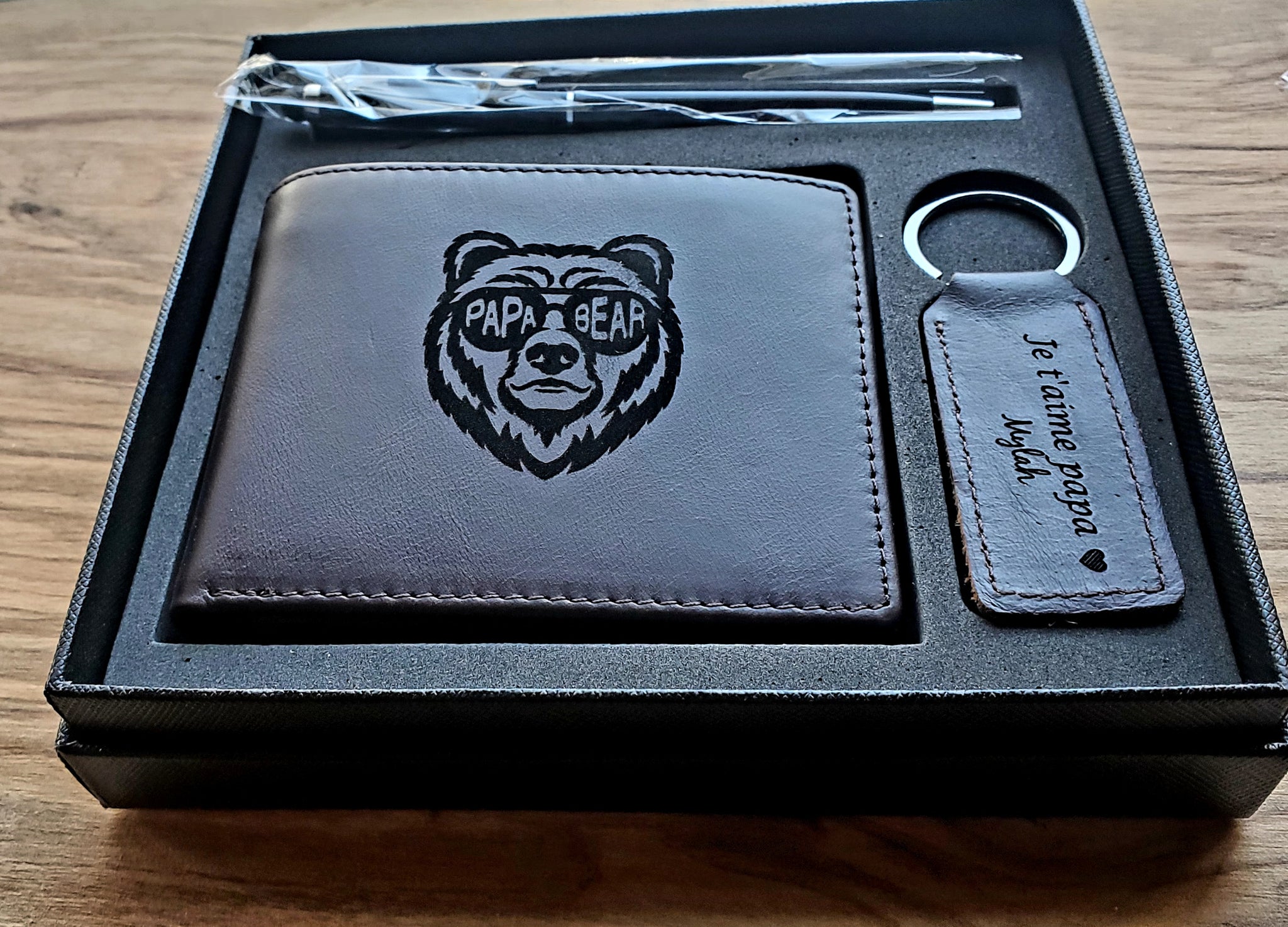 Un portefeuille fraichement gravé peut avoir des traces de poussières de cuir brûlé à la gravure et ce quand vous touchez la gravure les 1 ere fois ,ça peut nous tacher du noir .C est tout a fait normal .cela s'estampe avec le temps .Ne pas le frotter ou l'essuyer